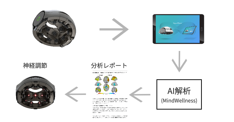 『iSyncWave(アイシンクウェーブ)』の後継機として、新たにリリースされた『iSyncMe(アイシンクミー)』は、『iSyncWave(アイシンクウェーブ)』のコア技術である『世界初の脳波測定とメンタルヘルスケアの融合ソリューション』をさらにアップグレードした『遠隔ケアが可能なメンタルヘルスケアプラットフォーム』デバイスです。