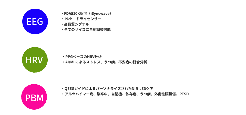 『iSyncWave(アイシンクウェーブ)』の後継機として、新たにリリースされた『iSyncMe(アイシンクミー)』は、『iSyncWave(アイシンクウェーブ)』のコア技術である『世界初の脳波測定とメンタルヘルスケアの融合ソリューション』をさらにアップグレードした『遠隔ケアが可能なメンタルヘルスケアプラットフォーム』デバイスです。